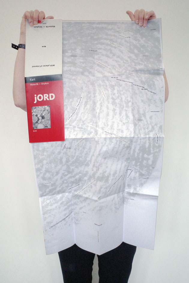 jORD combines poetry and fragments from case documents on landscapes and areas affected by new infrastructure. The map is produced as a dialogue between two artists who have worked with landscape, agriculture, words and soil for 30 years.