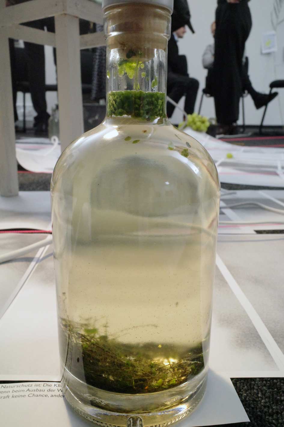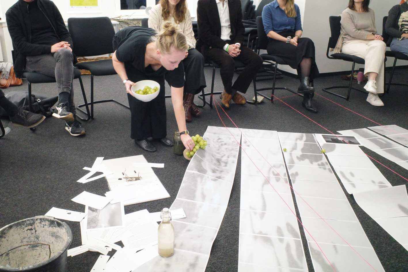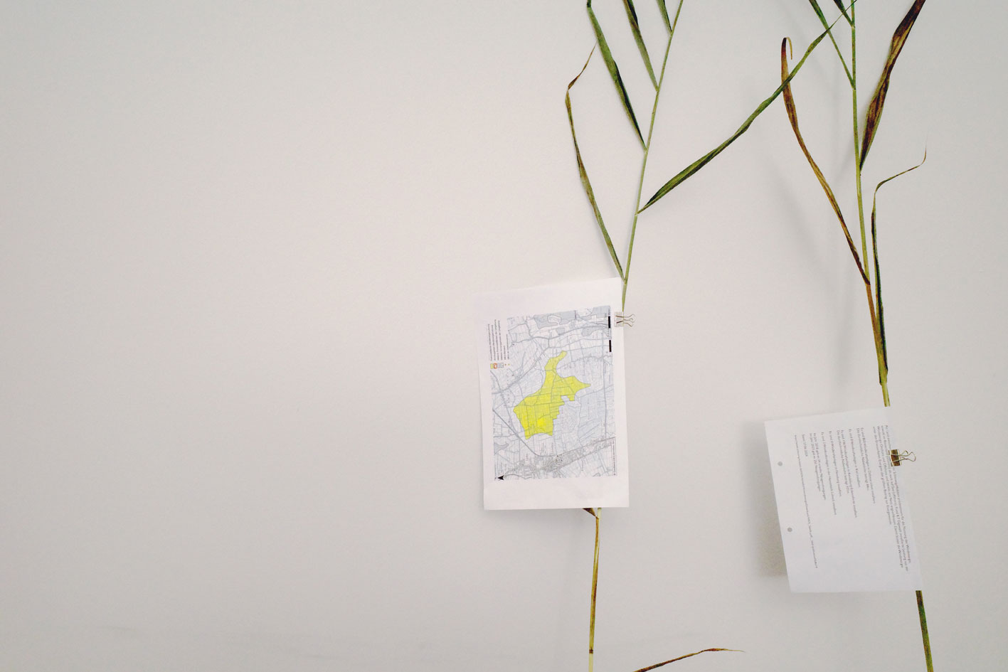 Material: Black and white photo of a landscape as a leporello in several A4 stripes, folder, neon pink mason's line, bucket, text fragments, water from the river Eider, water from the moor, oak with roots, reeds from the moor, grapes (from Italy), model of a wind turbine (battery operated), map of Schleswig-Holstein depicting suitable areas for wind parks, stool, stones, mud from the river Eider, extension cable, Luxo lamp