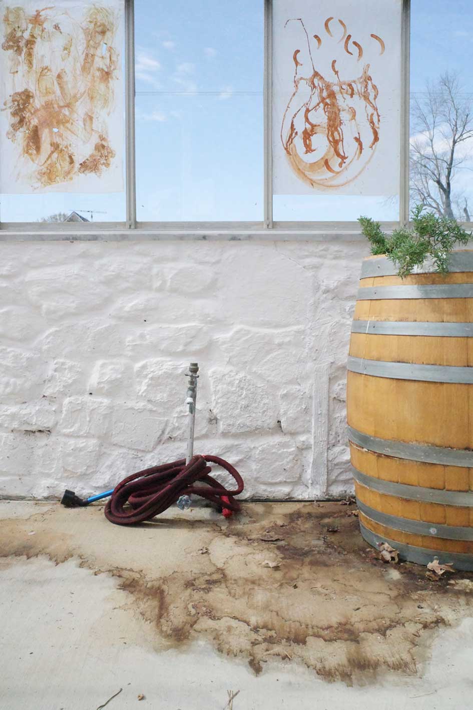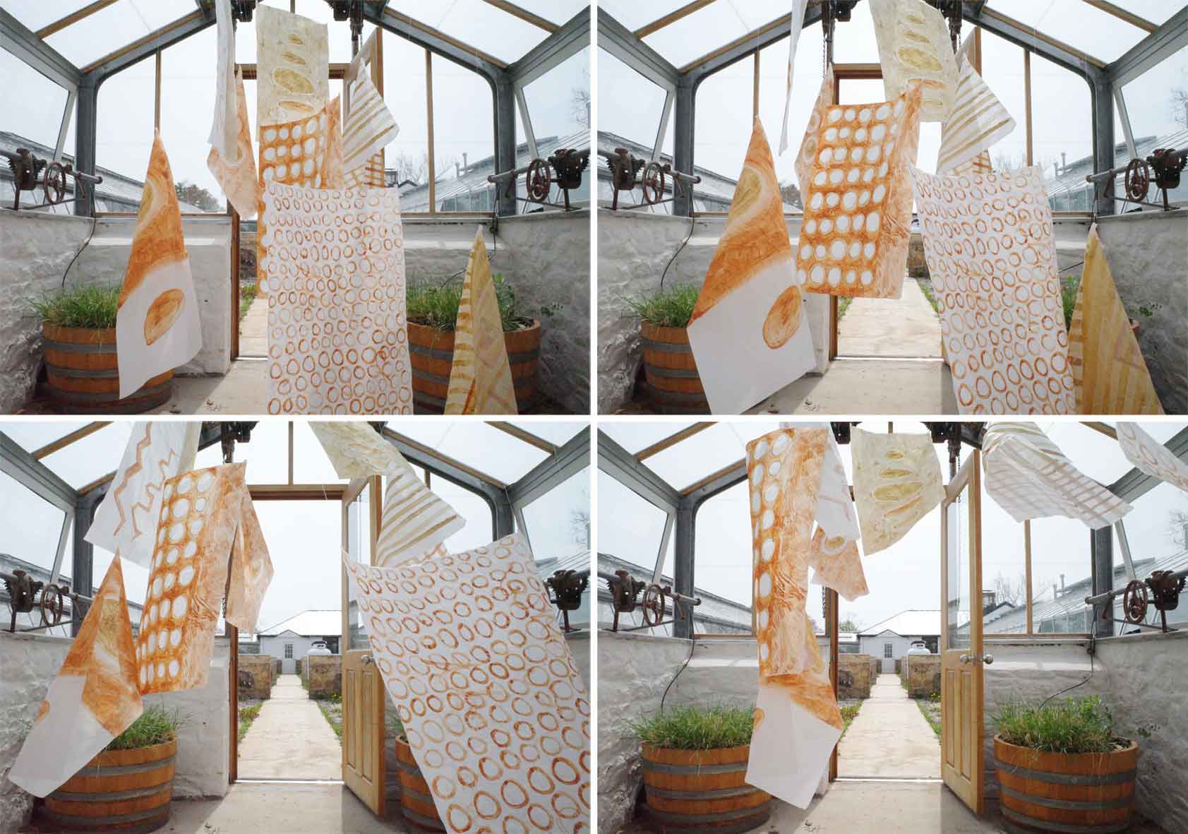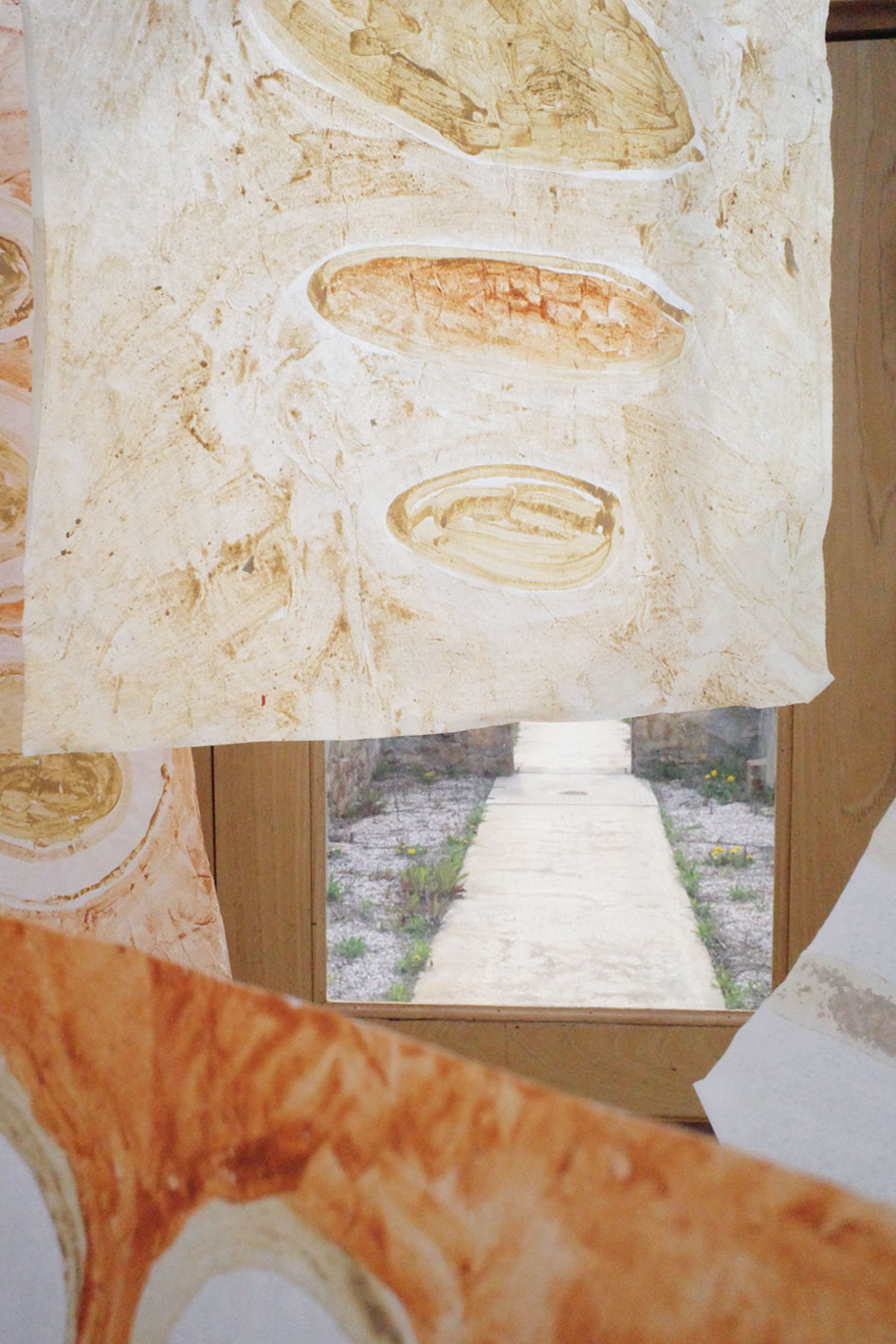 This is about the pure pleasure and lightness of being in a place that feels good, of literally sticking the fingers in the ground and discover what is right in front, underneath and above, and engage with what is at hand at that very moment. The resulting earth papers then hang in an airy place where soils are of major importance, between the outside and inside - in the greenhouse next to the vegetable production, under the supervision of the head tomcat.