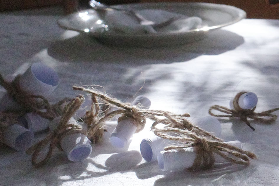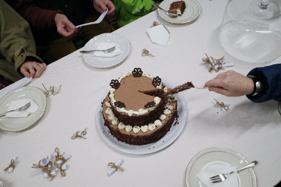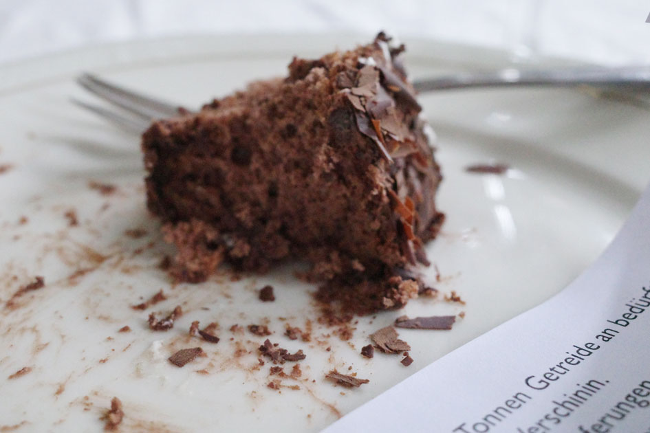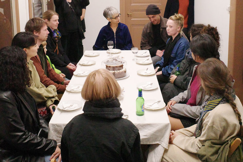 We read fragments of text while eating cake. These include quotes from investment bankers, headlines from the last few months, farming rules, stock market prices, poems and Bible passages. The table is surrounded by photos of cultural landscapes and collages depicting historic farming activities. Together with the public, we share baked goods to make abstract considerations tangible and conversational, moving from the micro to the macro level and back again: What do we have in front of us every day and rarely acknowledge it? What do we see without “seeing”? The table will remain as we left it for the next two months until the end of the exhibition. The cake is eaten.