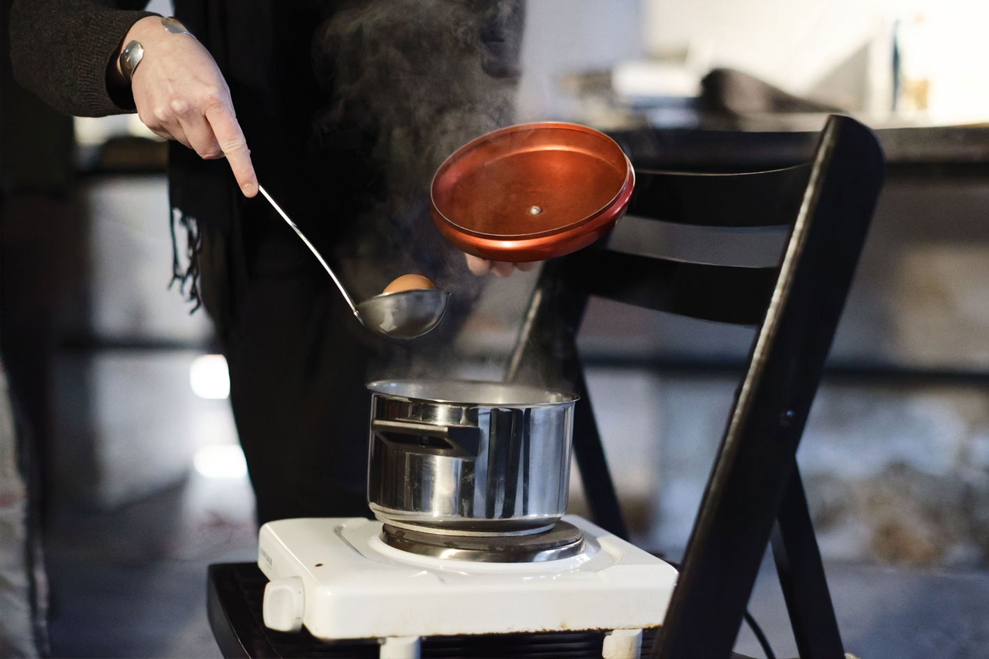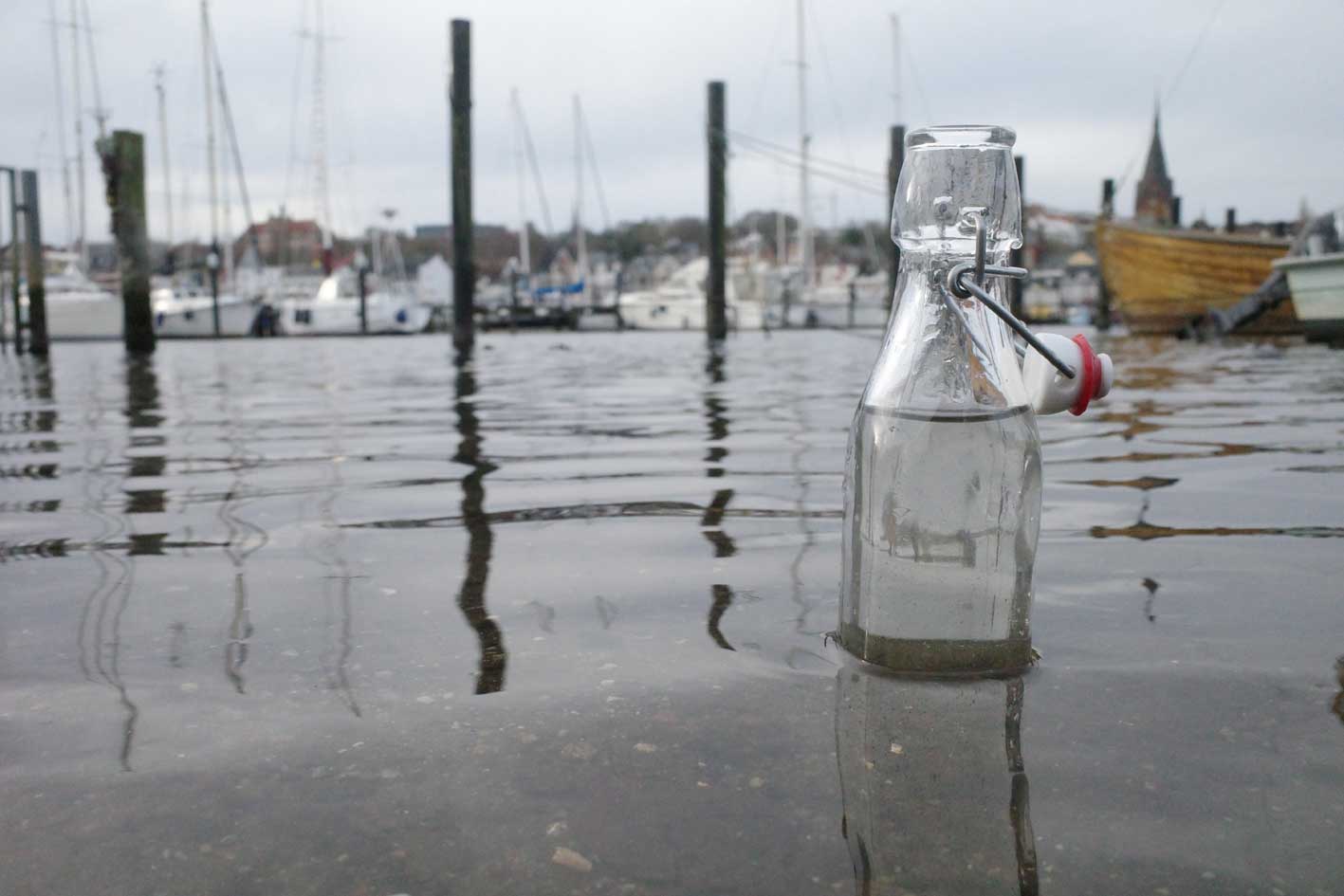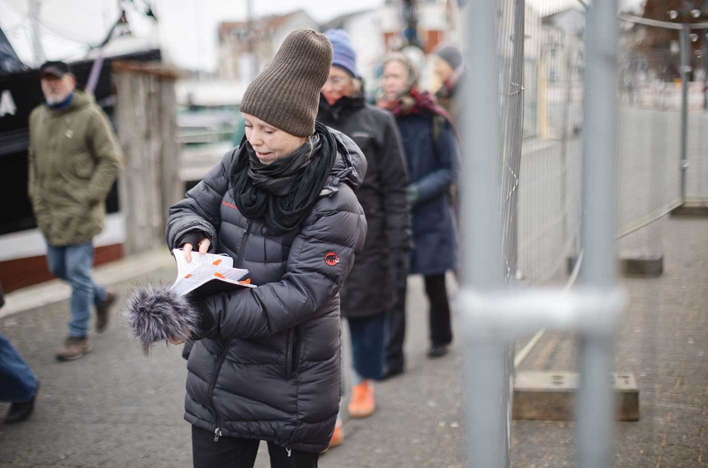I spent four days and three nights in Flensburg, enjoying wintry temperatures, frozen puddles, and clear skies. My accommodation was a well-heated Unimog caravan on the harbourfront, nestled between disused railway tracks, a fishing club, and main roads. I used the time to gather my own experiences and other people's stories about harbours: What happened at waterfronts? I visited the Maritime Museum, where the exhibit on Greenland was stuck in a drawer and the section on colonialism was relegated to a small space in the back building on the second floor. These stories were shared during a joint walk along the harbourfront and culminated in KRAN. Water from the Eider River, the Baltic Sea, and Copenhagen was mixed, while an egg was boiled for seven minutes and then dropped into cold water.