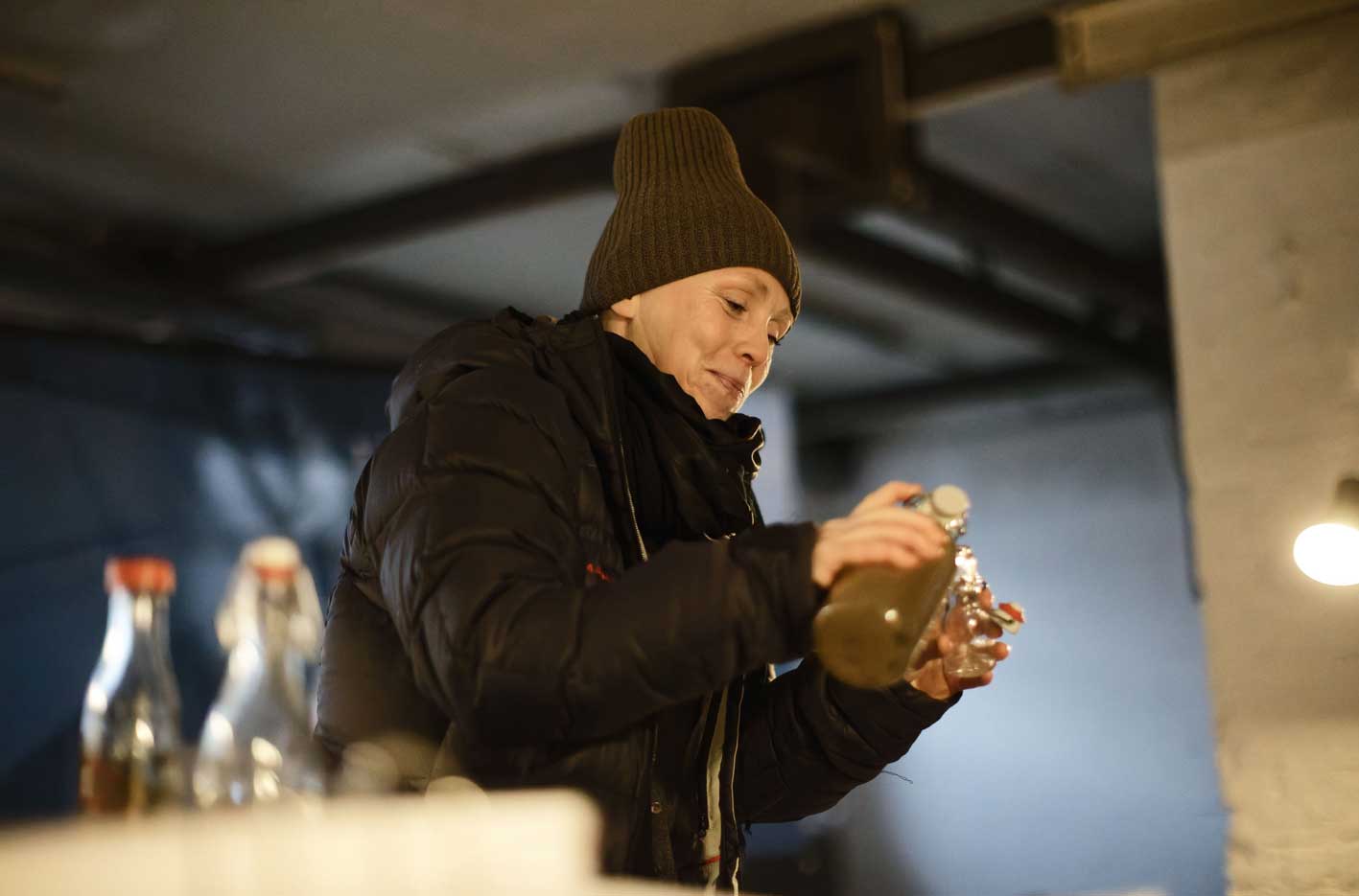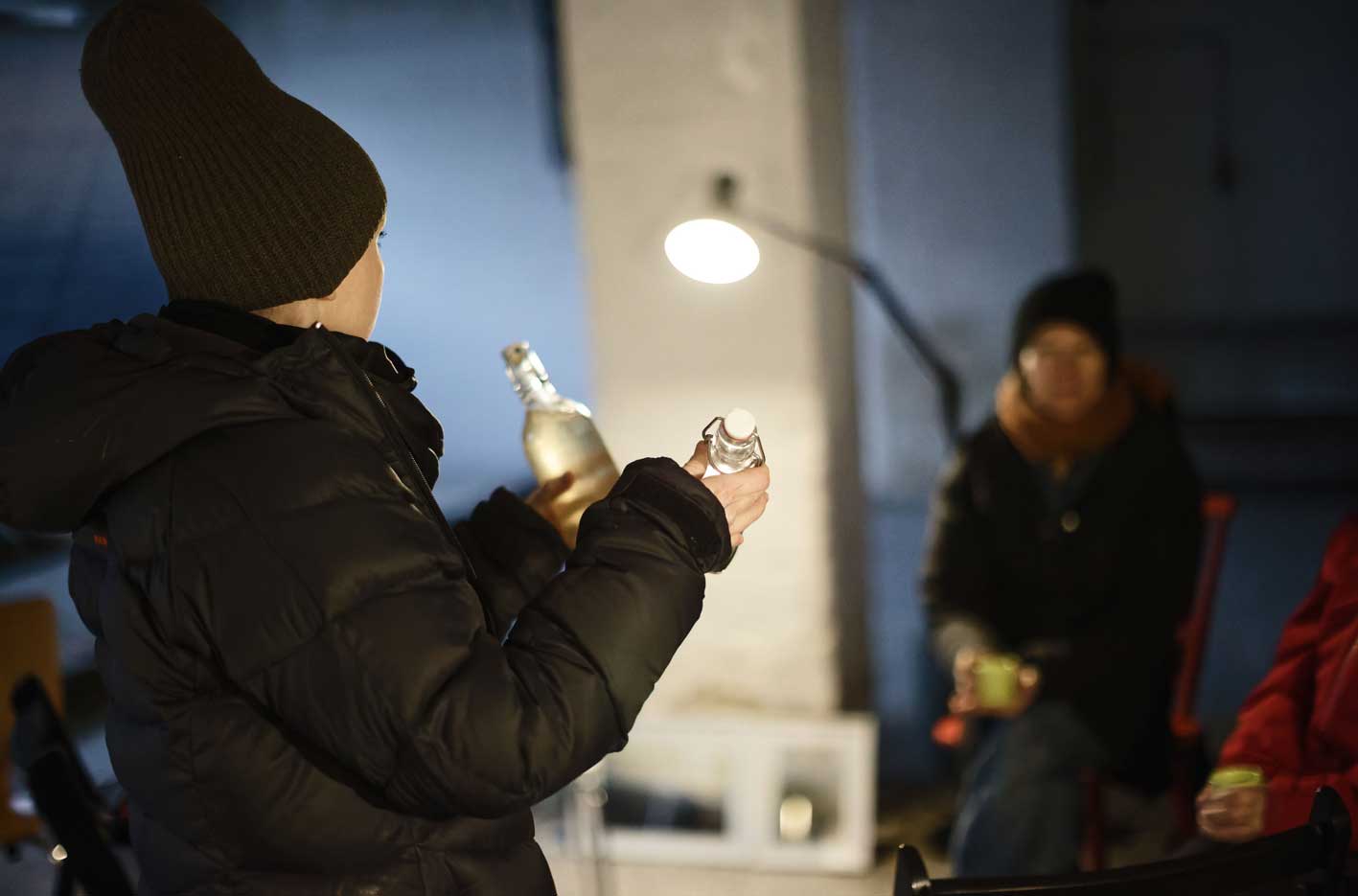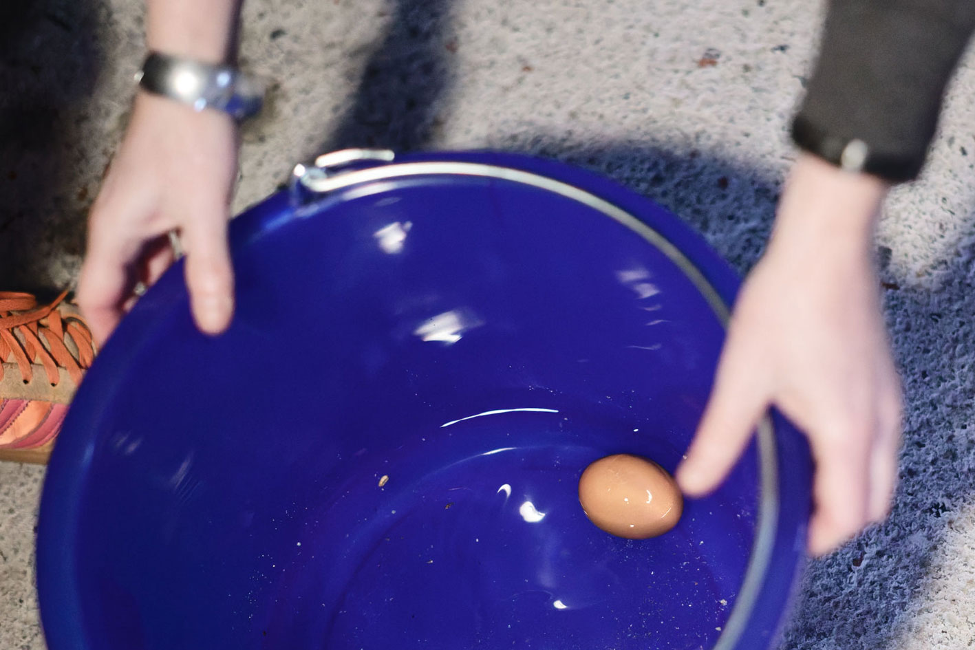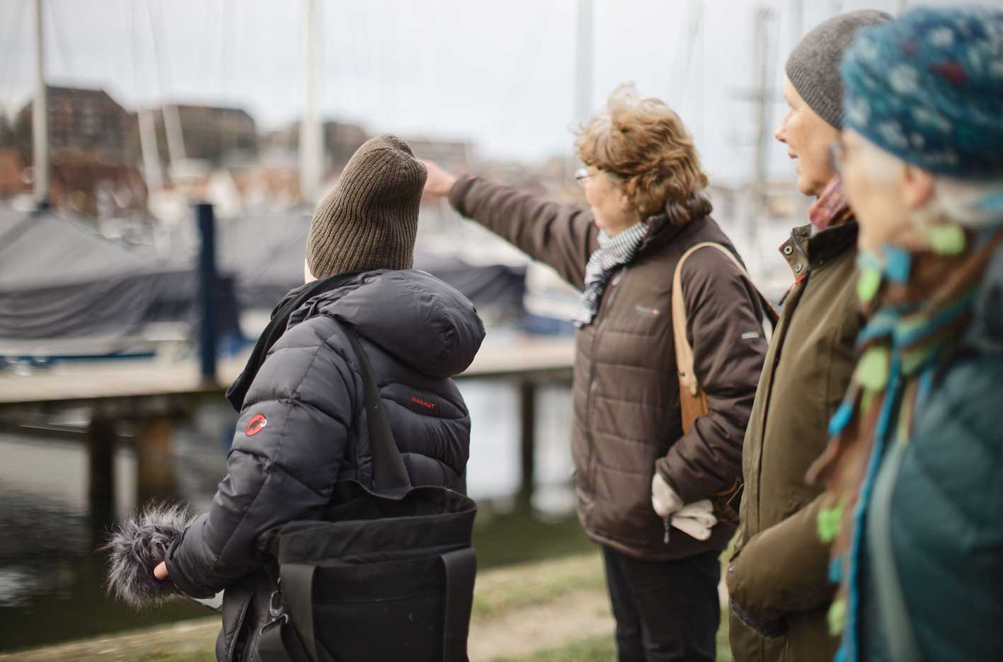 I spent four days and three nights in Flensburg, enjoying wintry temperatures, frozen puddles, and clear skies. My accommodation was a well-heated Unimog caravan on the harbourfront, nestled between disused railway tracks, a fishing club, and main roads. I used the time to gather my own experiences and other people's stories about harbours: What happened at waterfronts? I visited the Maritime Museum, where the exhibit on Greenland was stuck in a drawer and the section on colonialism was relegated to a small space in the back building on the second floor. These stories were shared during a joint walk along the harbourfront and culminated in KRAN. Water from the Eider River, the Baltic Sea, and Copenhagen was mixed, while an egg was boiled for seven minutes and then dropped into cold water.
