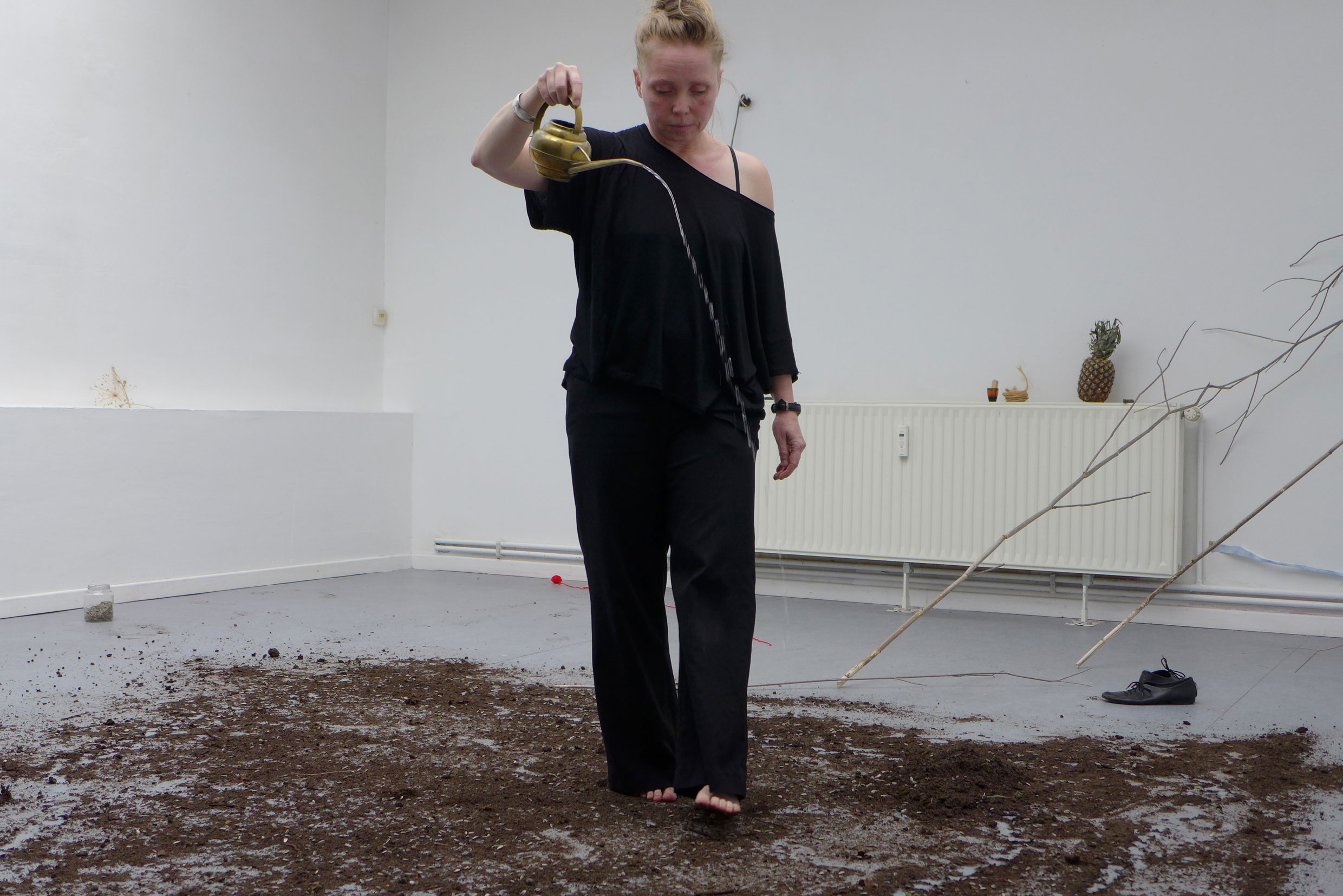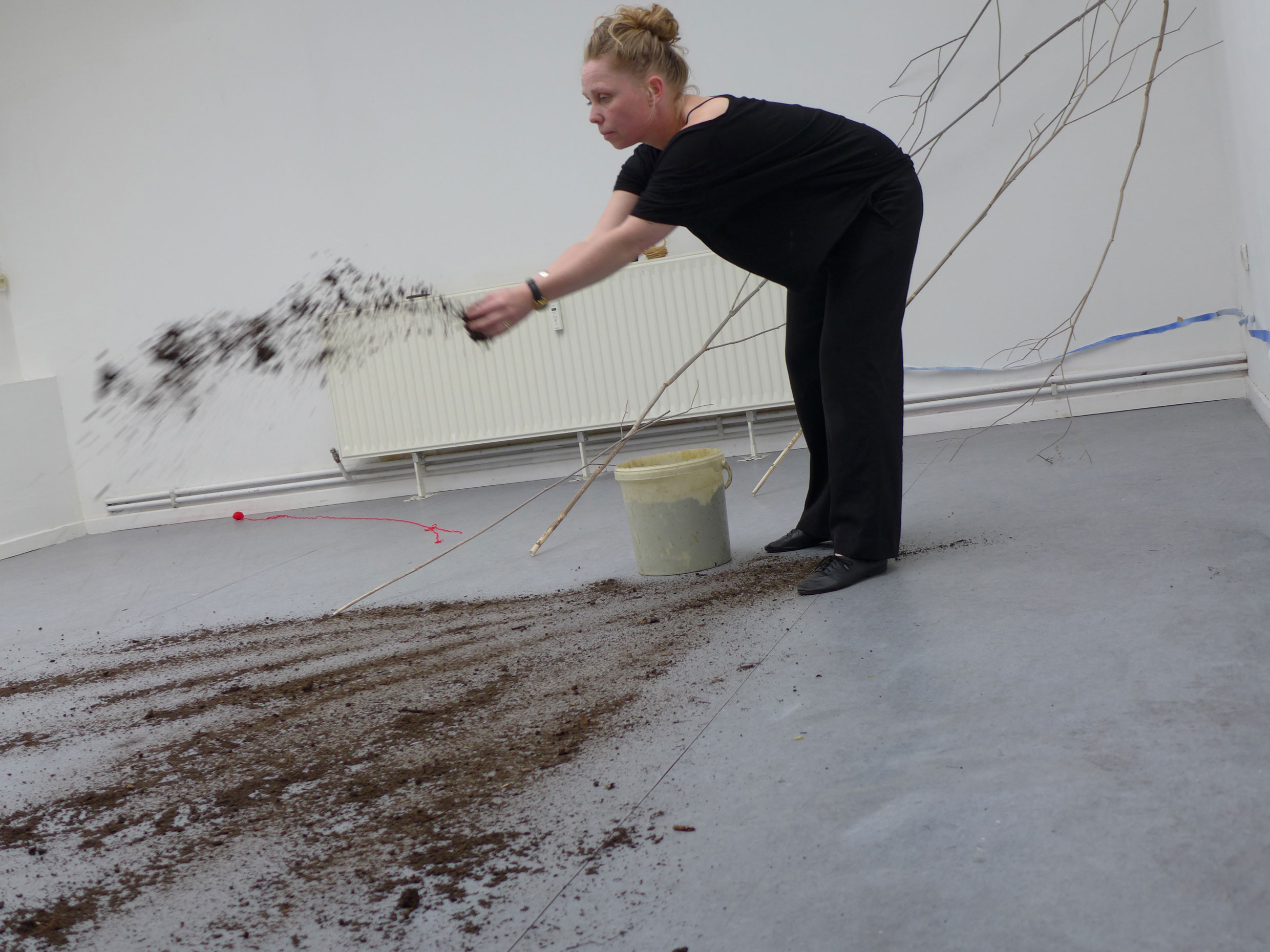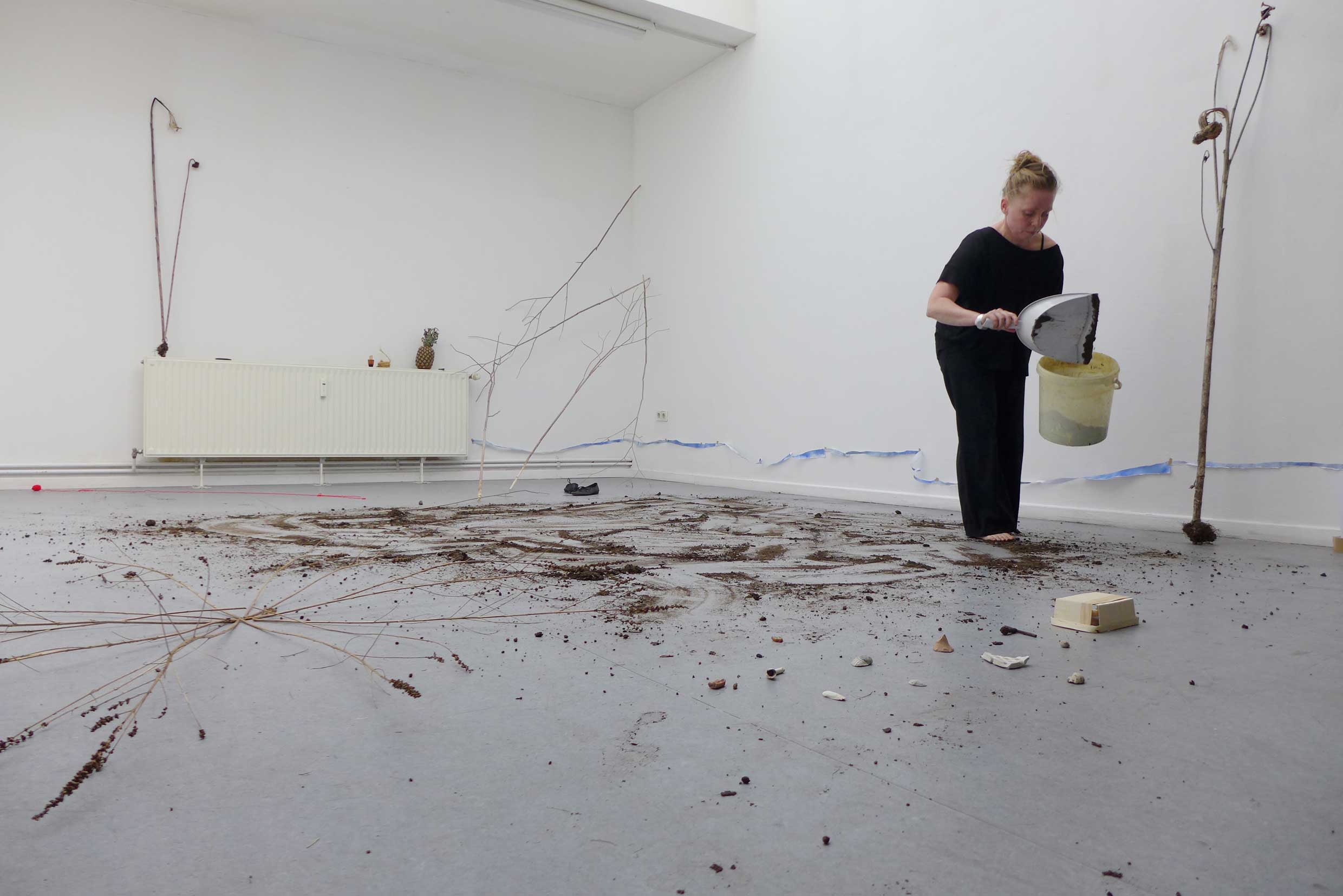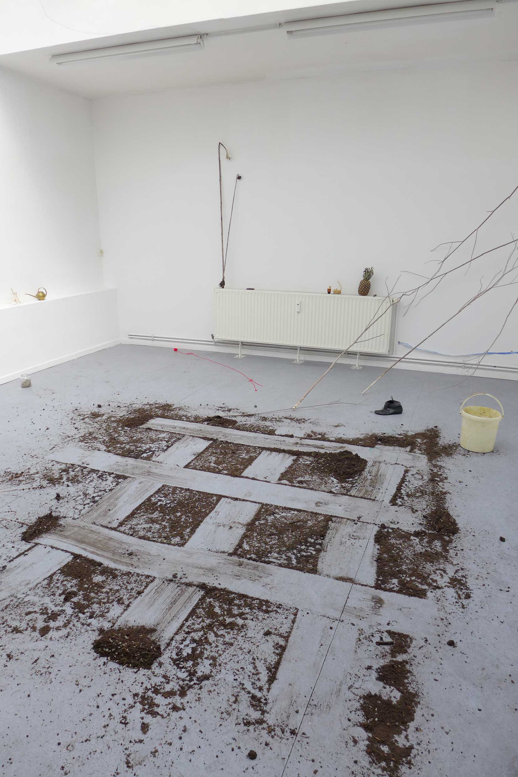 2022. Performance at Ilka Theurich - Project Space, Faust, and on the banks of the river Leine, Hannover. /// Materials: red thread, pineapple, blue paper, sunflower seeds, compost, dustpan, bucket, twigs, water, watering can, knife, recipe for beaver roast ///