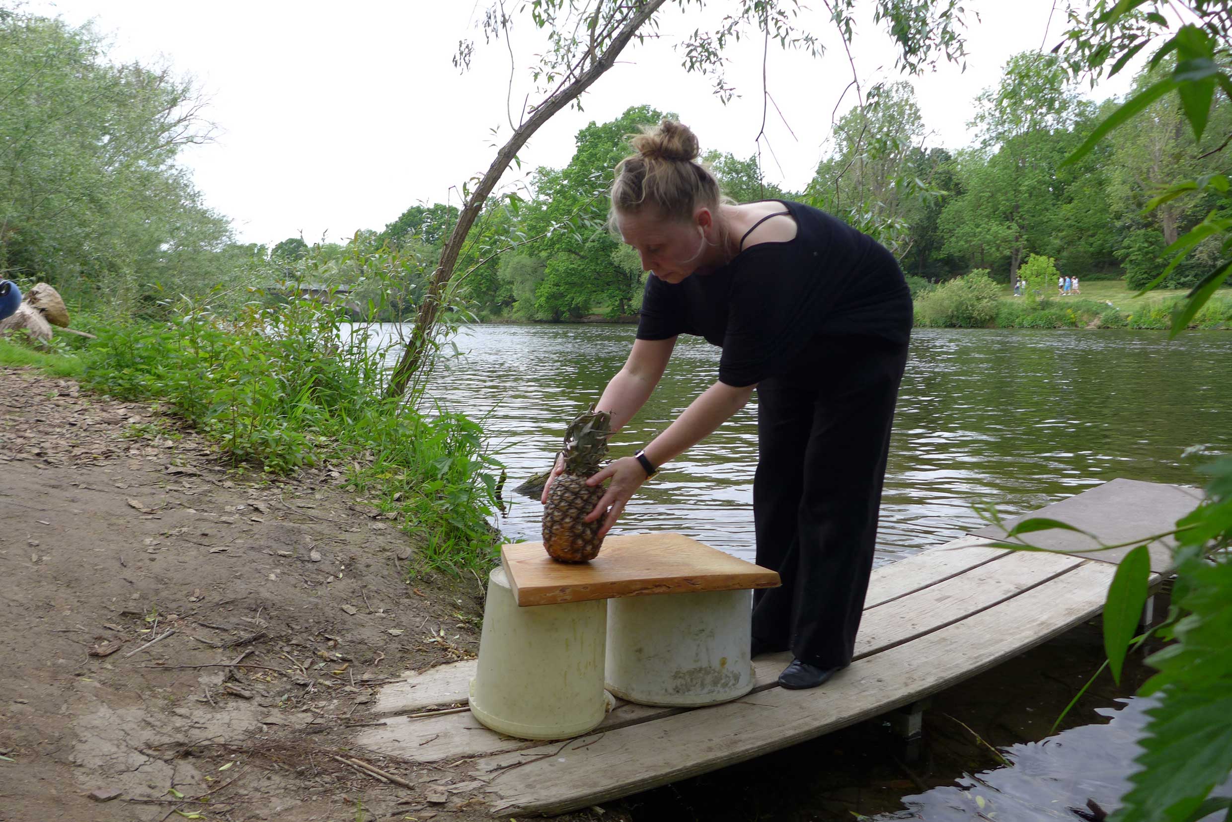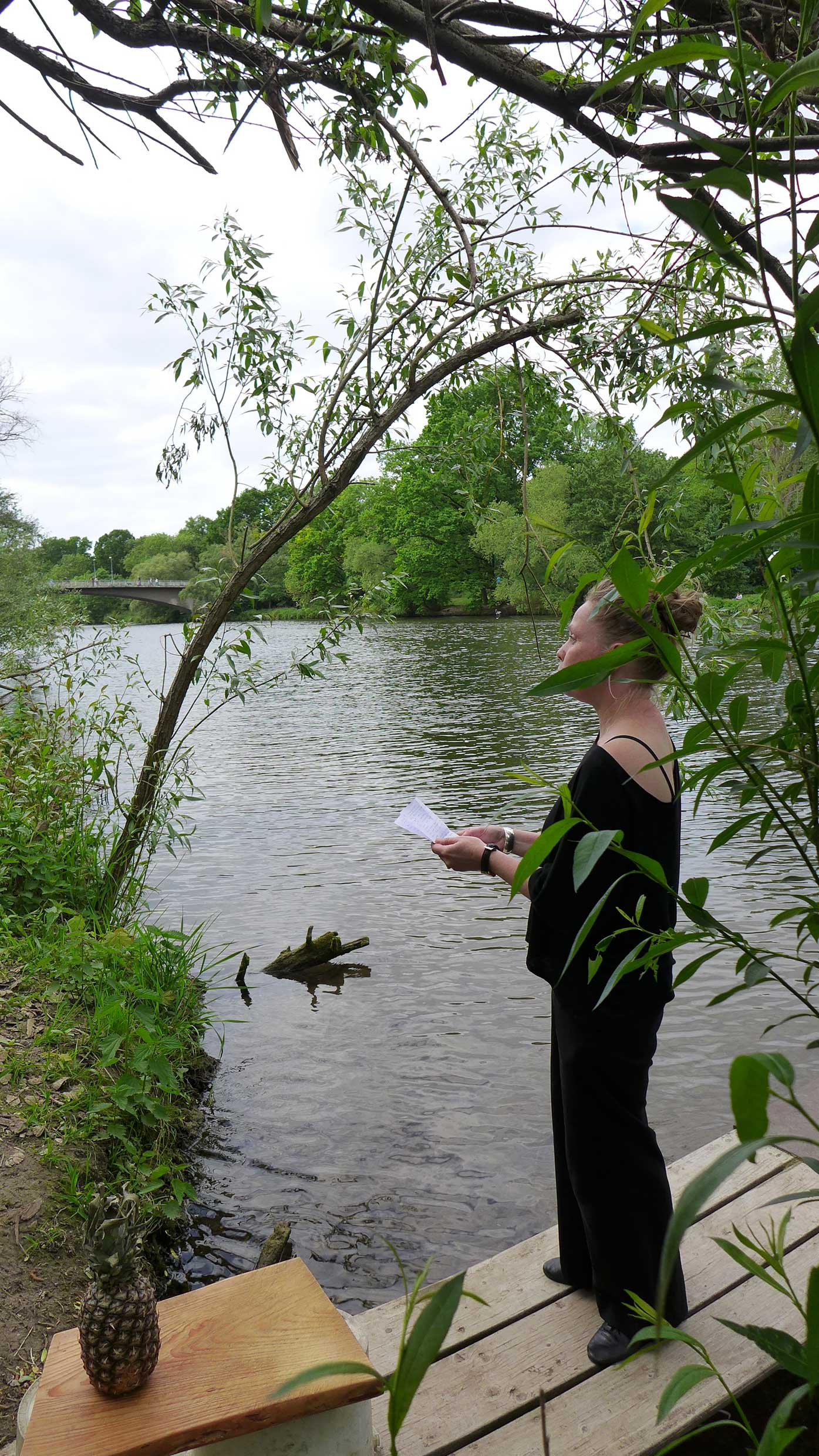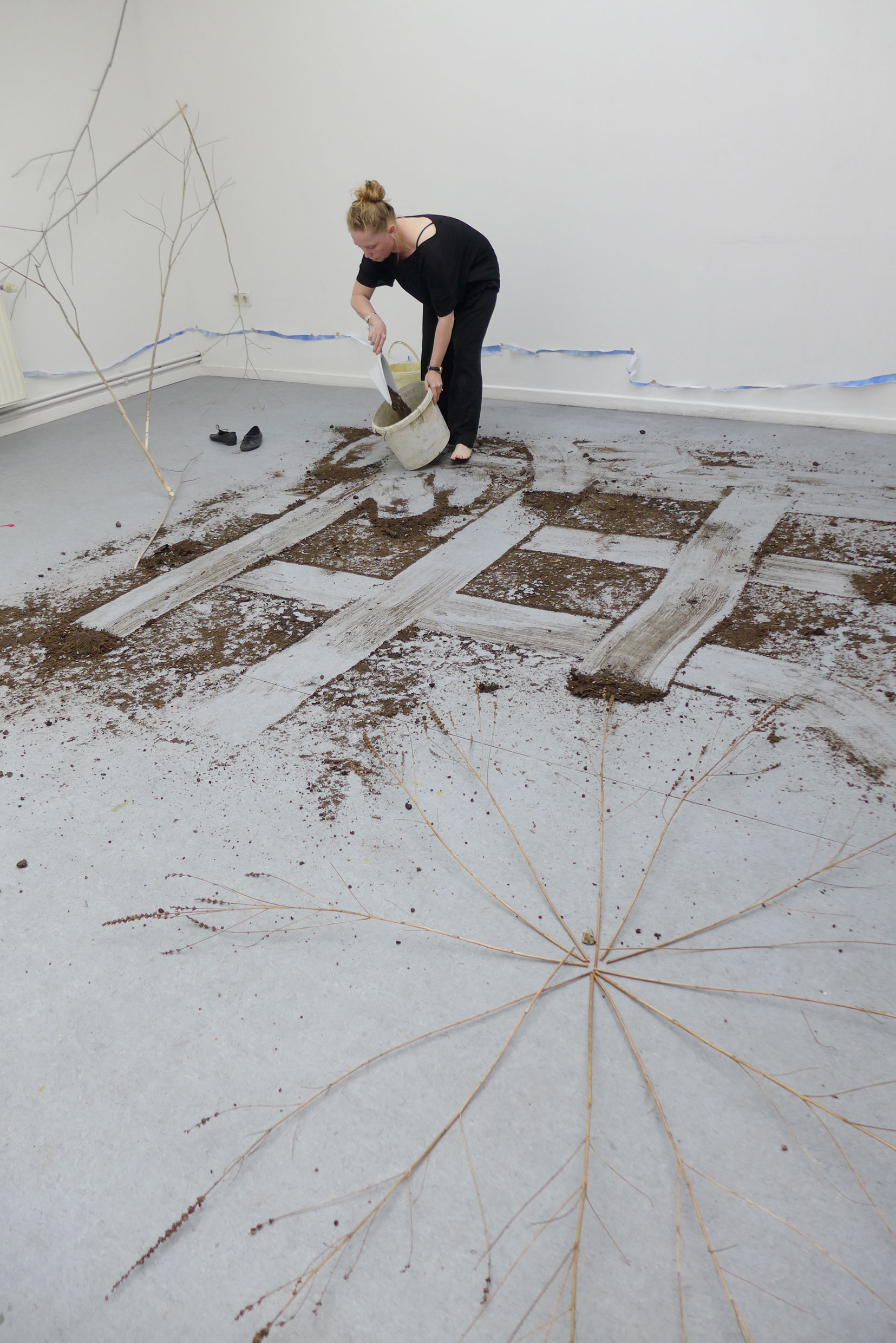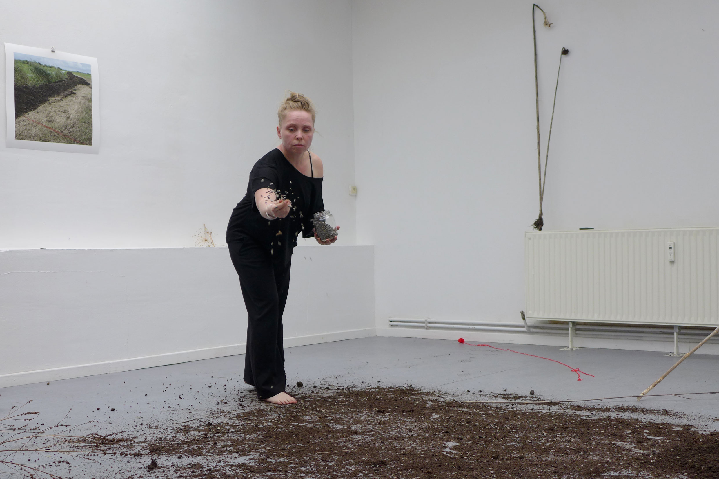 2022. Performance at Ilka Theurich - Project Space, Faust, and on the banks of the river Leine, Hannover. /// Materials: red thread, pineapple, blue paper, sunflower seeds, compost, dustpan, bucket, twigs, water, watering can, knife, recipe for beaver roast ///