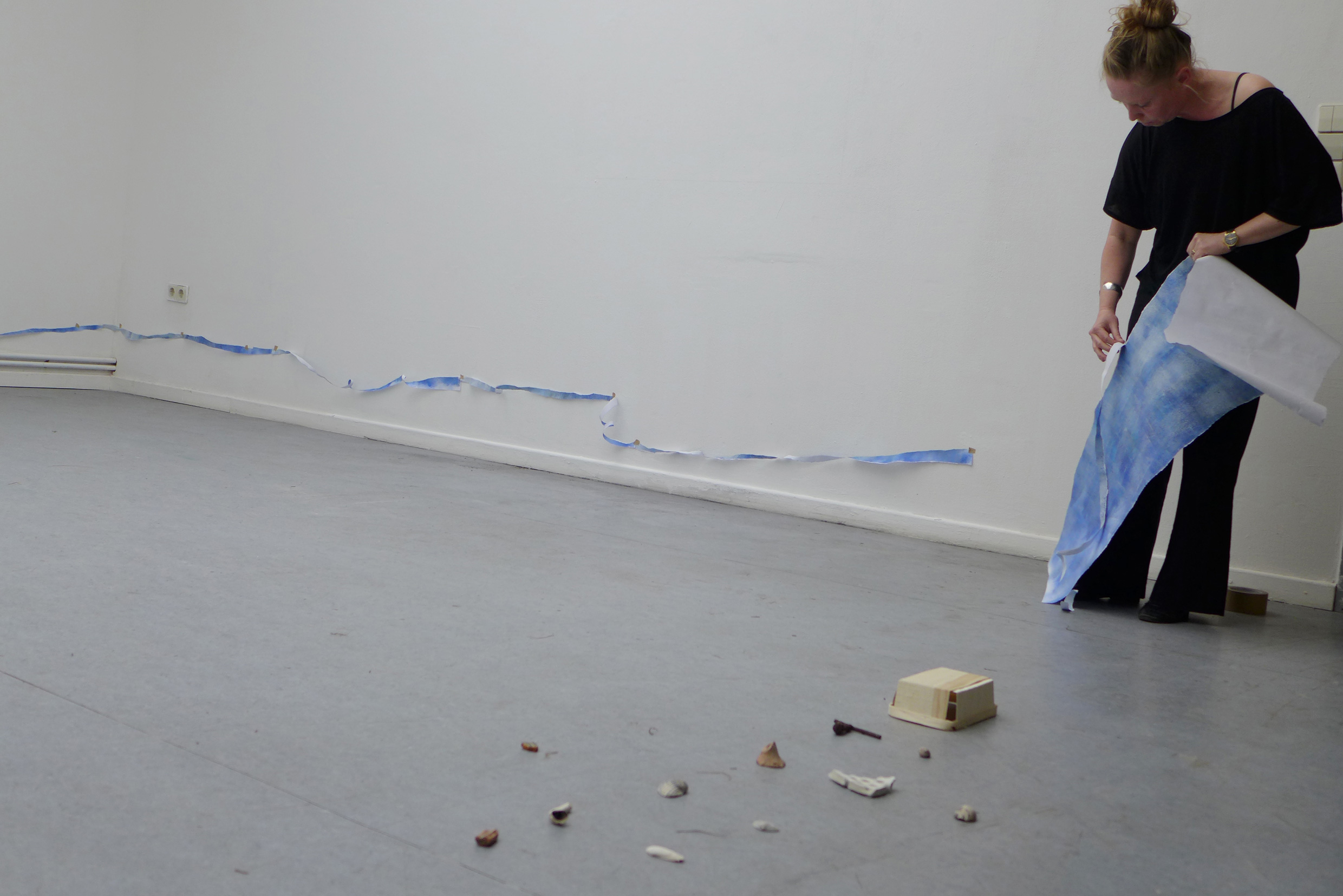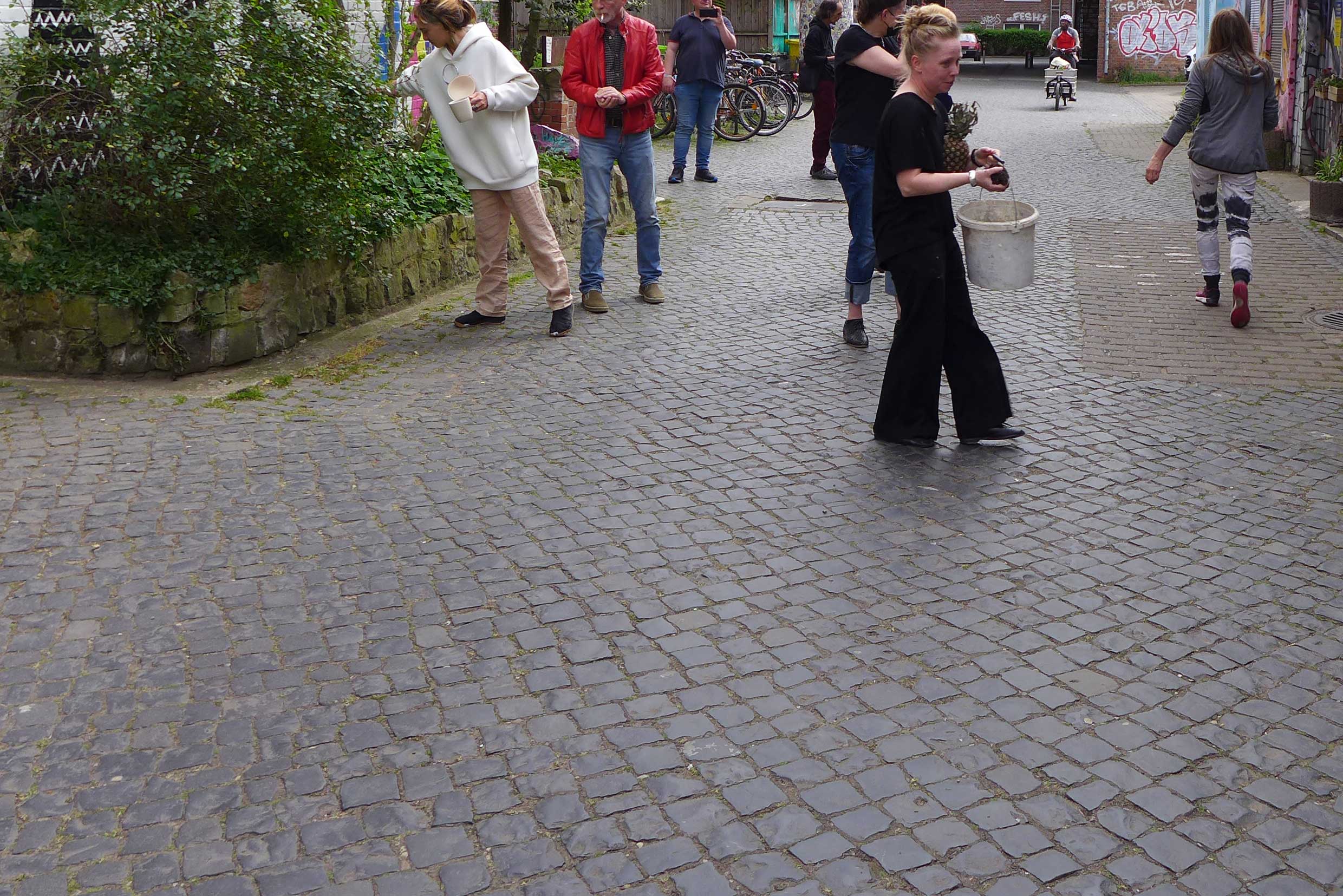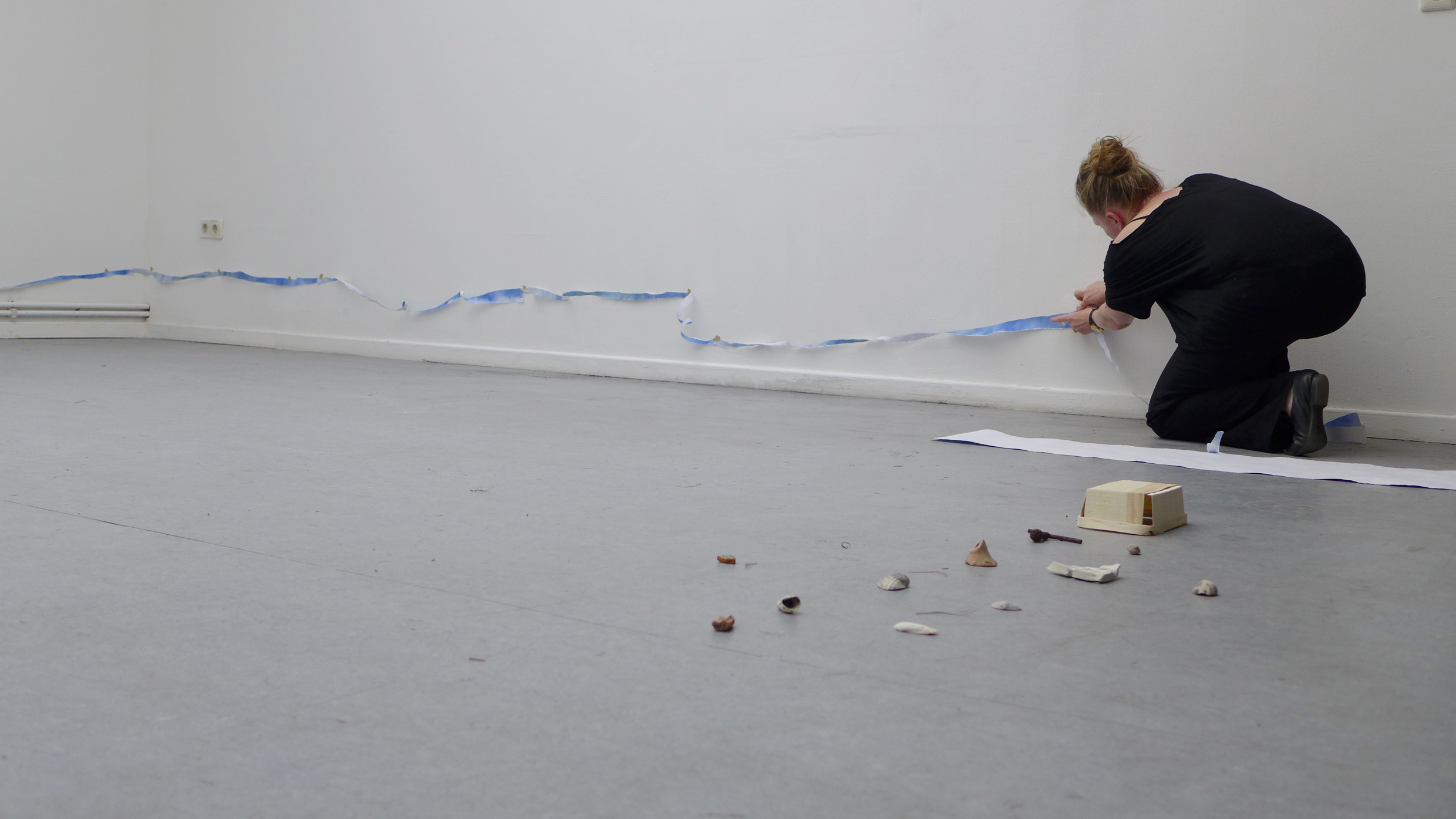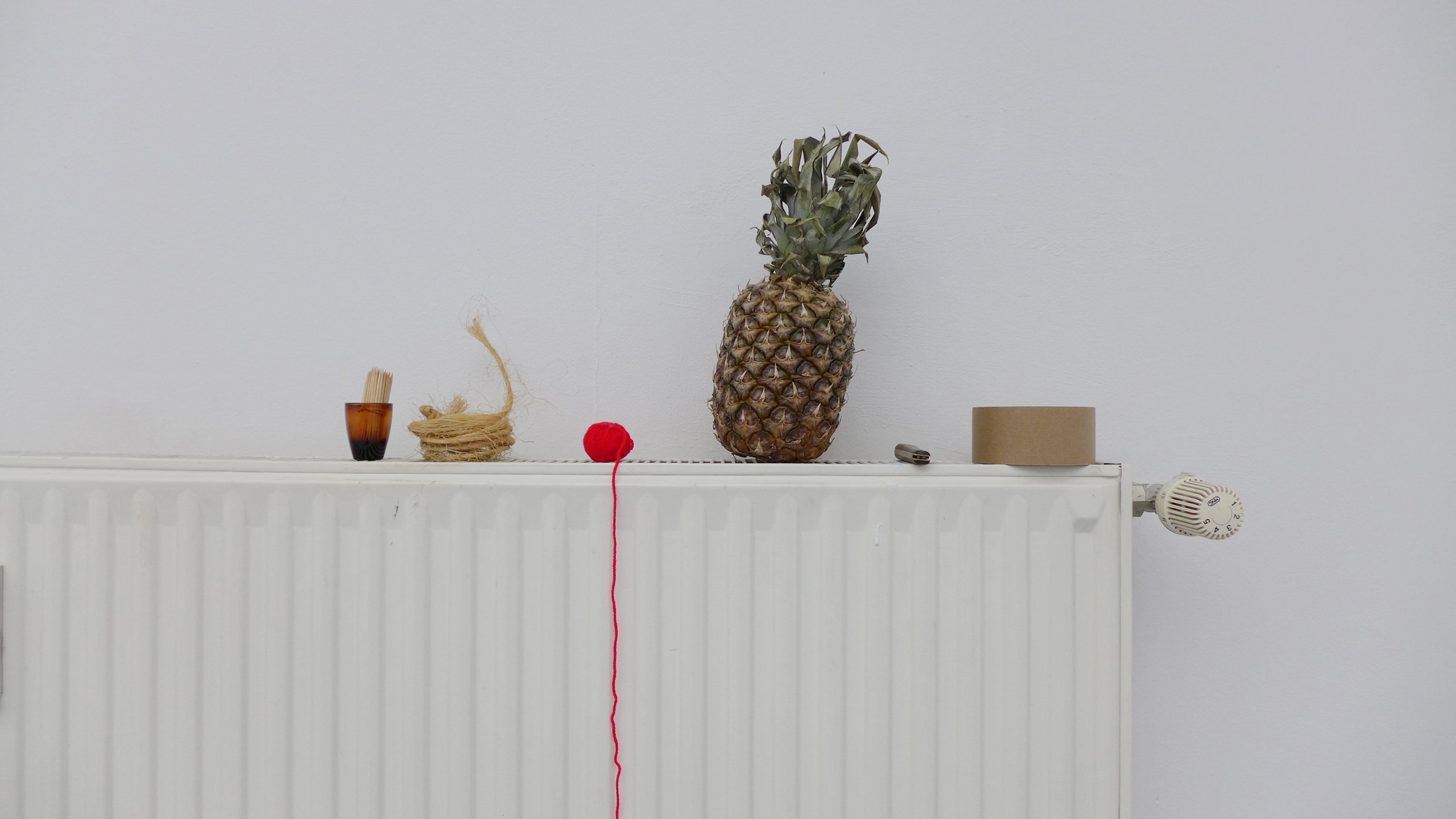 2022. Performance at Ilka Theurich - Project Space, Faust, and on the banks of the river Leine, Hannover. /// Materials: red thread, pineapple, blue paper, sunflower seeds, compost, dustpan, bucket, twigs, water, watering can, knife, recipe for beaver roast ///