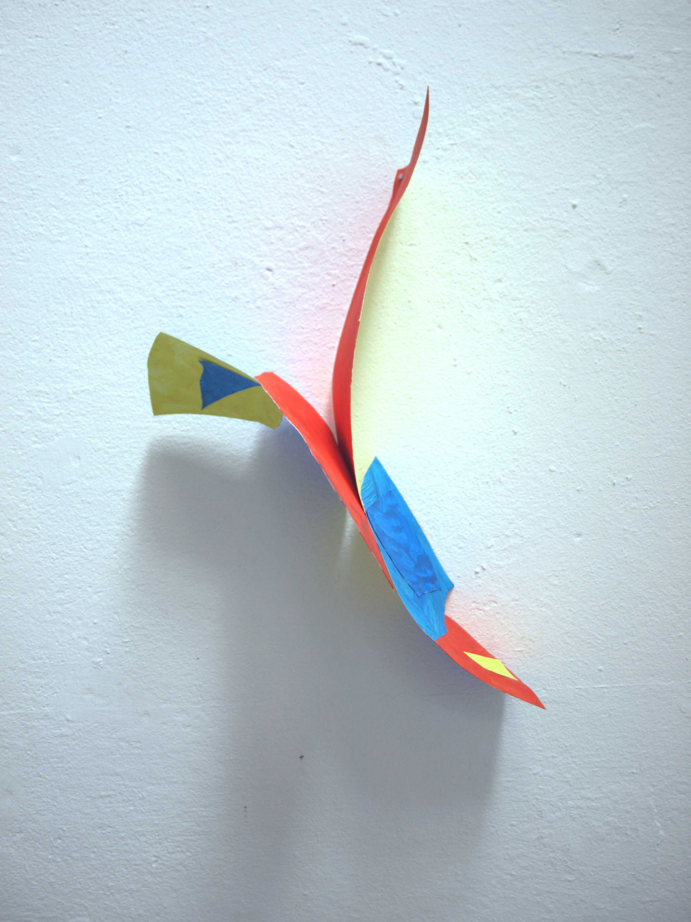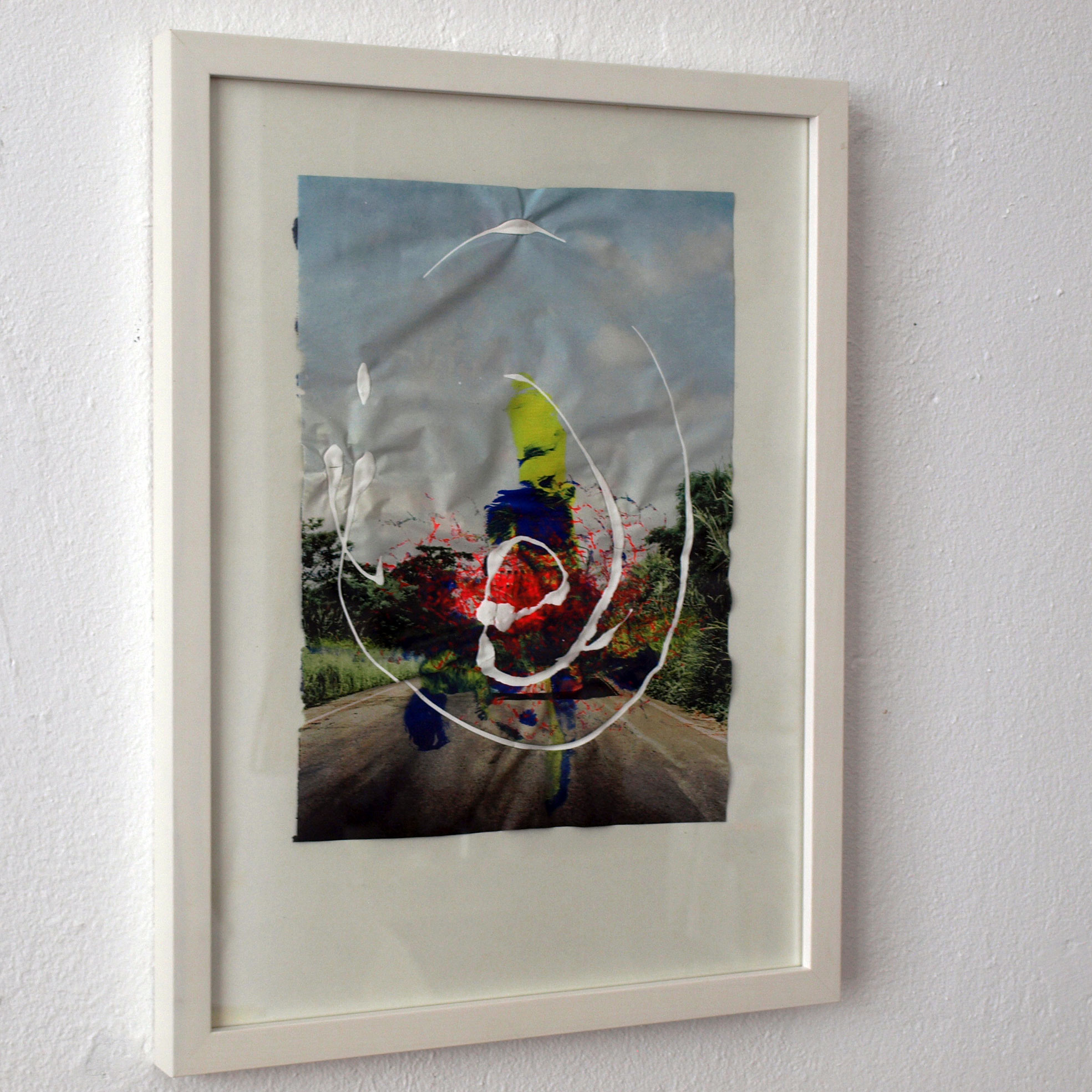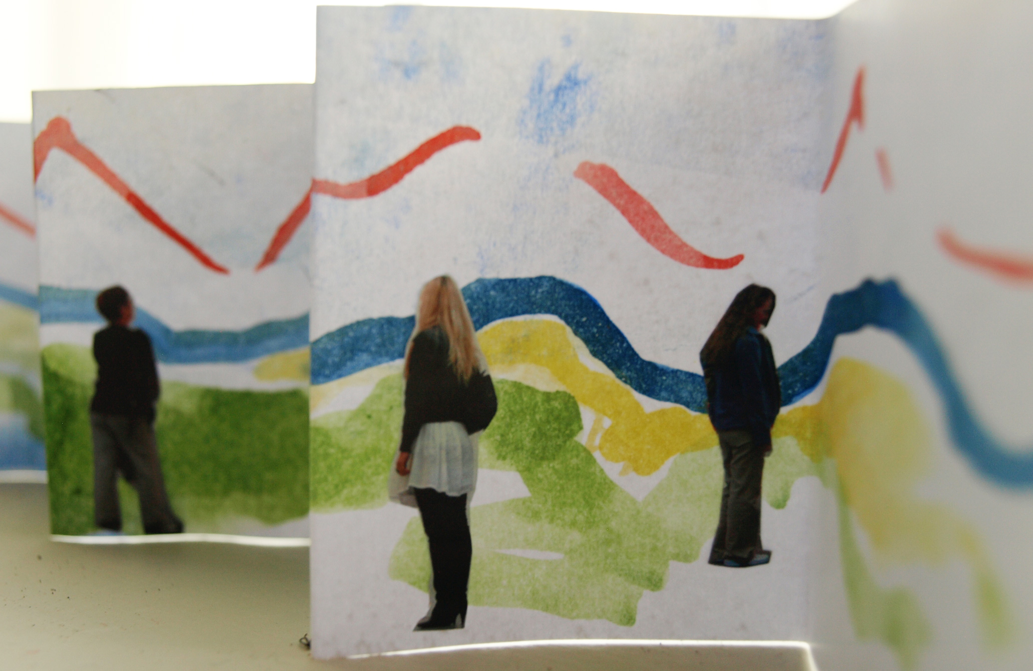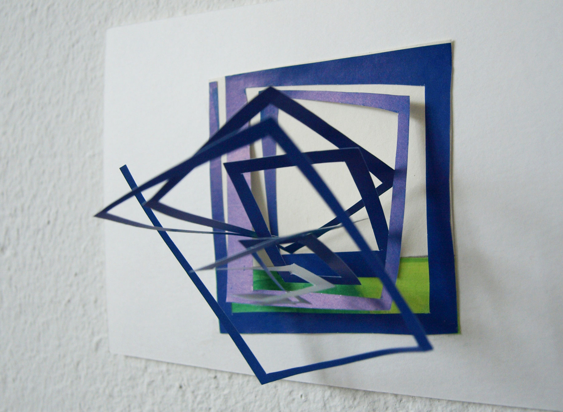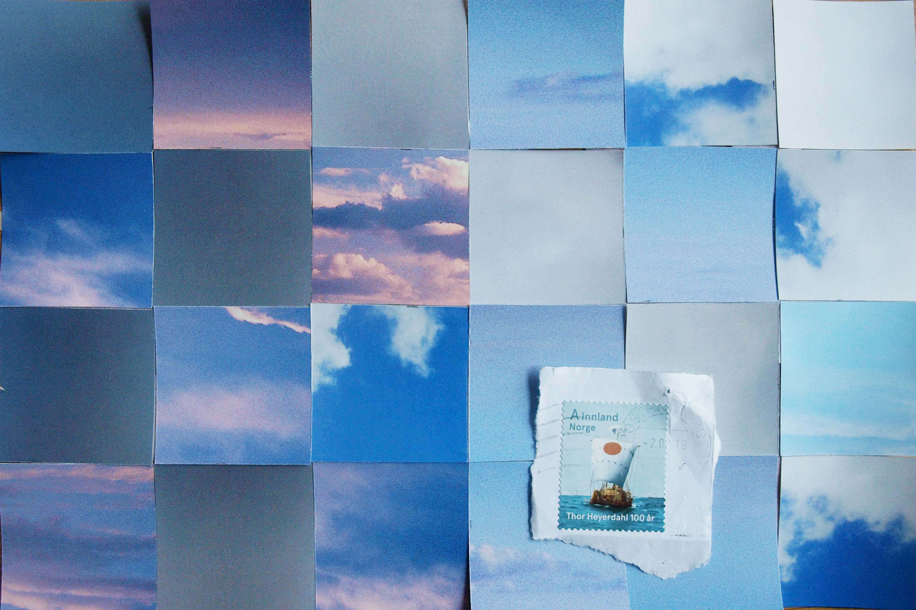 Not being able to go and travel as planned, I travel inside my head and find myself near the mountains and next to the sea. I re-shape images that I've gathered during journeys over the last years, such as historic postcards of the Rhone glacier in Switzerland, bridges in New York, and ice in the north. I work back and forth in layers at and on the wall. The different papers are canted, clamped, hung and glued together, and appear as paths that keep dividing and meeting.
