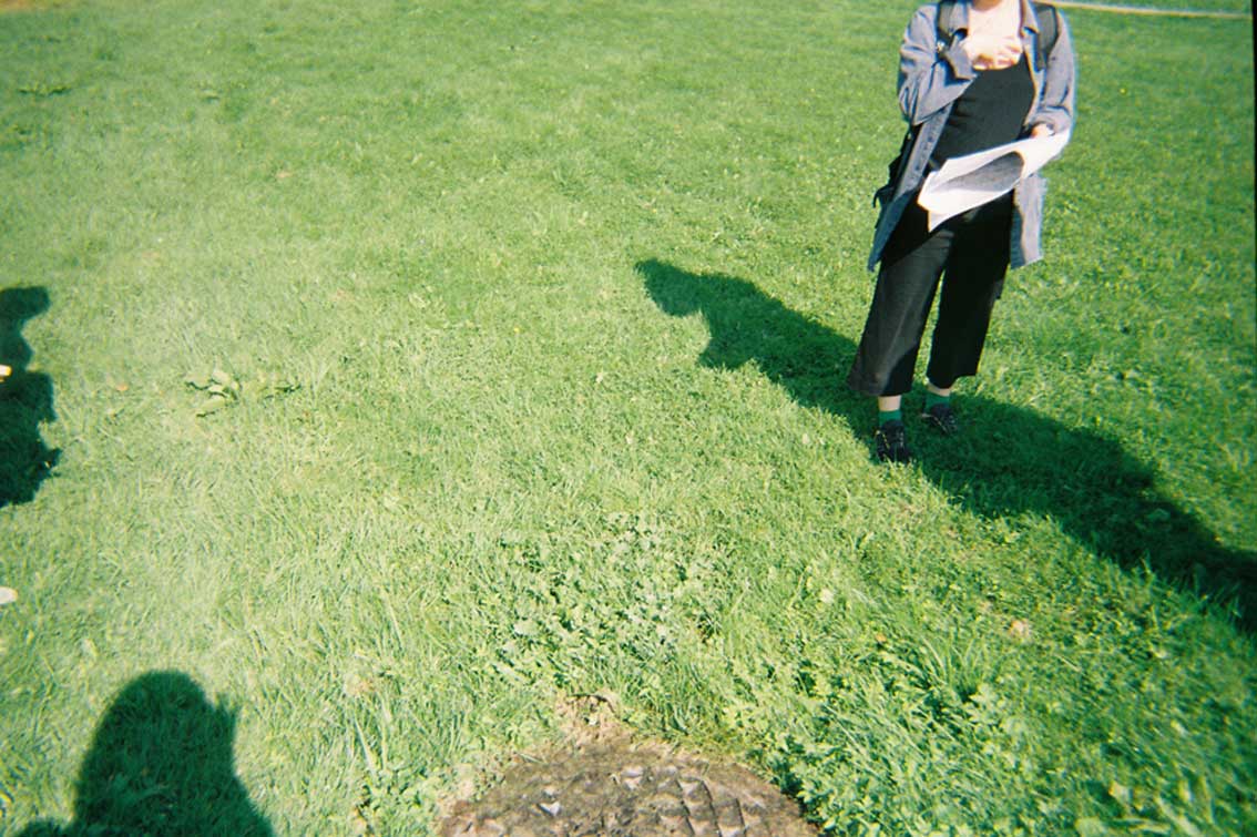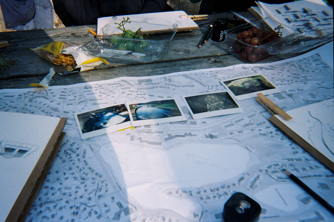 We look, draw, watch, listen to find the underground stream. We manage to locate and trace it by studying historic and infrastructure maps, by listening to sound of running waters underneath manhole covers, and by suddenly getting our feet wet on the lawn, where the stream hasn't been fully drained.